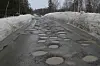 Flere av vannhullene var store som kratere og nådde flere plasser helt ned på pukklaget, ettersom en stor del av toppdekket har forsvunnet ned i grøfta.