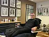PÅ PLASS. Frode har tatt plass i behandlingsstolen. På veggen bak han henger en rekke karikaturtegninger laget av en annen Saltdals kunstner, Katarina Storalm. Bildene skal forestille ulike grimaser kundene til Vanitas klinikken ofte må prestere.