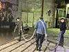 AVRETTER. Her er Kurt Bjørnli og Evert Karlsson i aktivitet med å håndtere slangen, mens en representant fra Weber Gulvavretting fordeler massen med kyndig hånd. Endre Grønnslett overvåker prosessen.