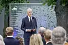 Statsminister Jonas Gahr Støre under minnemarkeringen ved minnestedet utenfor Høyblokka i regjeringskvartalet 14 år etter terrorangrepet den 22. juli.