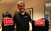 Her viser han fram ferske T-skjorter med postnummer-skiltene fra Rognan og Røkland.