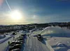 Sola skinner fra knallblå himmel og Sandbakk må finne fram solbrillene. Ti minusgrader biter litt i nesen på oss som er ute.