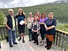 SAMLET I SULIS. Saltenposten fikk lov å avbryte vaffelfesten hjemme hos Lisbeth Kvæl for å få tatt dette bildet. Fra venstre Karl-Arne Hernes som kom med gode tips og råd for ferden videre, Ane Ingeborg Kalbækken som går Norge på langs, og de lokale sanitetsdamene Inga Baadstrand, Ingalill Moen, Laila Kvæl, Lisbeth Kvæl og Torill Vorren Gustavsen.