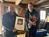 FIKK PRISEN. Her mottar Ulf Bakke Ildsjel prisen for august av daglig leder i Saltenposten Sverre Breivik i Næstby-brygga.