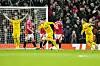 SJOKKERTE HJEMMELAGET. Håkon Evjen scorer under fotballkampen i Europaligaen mellom Manchester United og Bodø/Glimt på Old Trafford.Foto: Fredrik Varfjell / NTB
