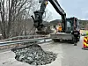 MIDLERTIDIG LØSNING. Her på brua like ved Nystadveien i Valnesfjord har det oppstått et synkehull i asfalten. Her er arbeidet med å reparere det i full gang.