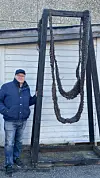 Ove Andreassen sammen med kunstverket slik det fremstår i dag utenfor VevAlPlast.Jan Håkonsen