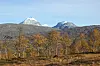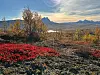 Høstdag i Sulitjelma. Flotte høstfarger i forgrunnen og majestetiske fjell i bakgrunnen.