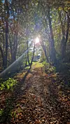 HØSTBILDE. Solstreif på stien som er dekket av høstløv.