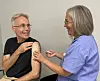 FIKK VAKSINEN. Helsesykepleier Christin Liepelt setter den nye pneumokokkvaksinen Prevenar 20 på kommuneoverlege Kjell Gunnar Skodvin i Saltdal, som er i målgruppa som 65-åring.