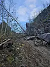 ADVARER. Skogsveien opp mot Litlverivatnet i Rago nasjonalpark er sperret av et ras. - De som har tenkt seg hit bør velge et annet sted å gå tur, sier leder i grunneierlaget Morten Skoglund.