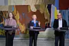 Tuva Moflag (Ap), Kristi Bergstø (SV) og André Myhrvold (Sp) under pressekonferanse på Stortinget etter SV og regjeringspartiene kom søndag til enighet om statsbudsjettet for 2025. Foto: Javad Parsa / NTB