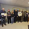 BLE TAKKET. På vegne av Beiarn kommune mottok varaordfører Espen Karlsen (i lys skjorte) diplom, Bjørn Vilhelmsen (t.v.) mottok diplom og medalje, Serhii Lukianchuk (t.h.) og Marit Moldjord fikk også egne medaljer på bakgrunn av bistanden.